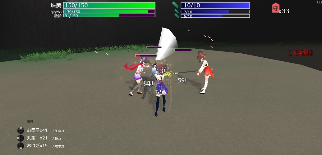 | Q.お団子・丸薬の回復量計算どうなってるの? | A.生命力が減っているほど多くの回復量が割り当てられます。Maxになるまでトータルは変わりません。 (50回復するお団子の使用時生命力が珠美10%、あやめ90%、歌鈴50%なら 回復量は珠美が30、あやめが3、歌鈴が17回復) |